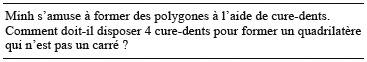 Plusieurs étudiants ont d’abord été déstabilisés par le fait de ne pas avoir de véritables cure-dents à leur disposition; leur remplacement par des stylos a été finalement accepté et certains d’entre eux n’ont produit que des carrés. Ils ne pouvaient former que la figure la plus particulière qui soit : un carré en position prototypique sur la table. Ces mêmes étudiants pouvaient reconnaître un losange parmi des quadrilatères, savaient en dessiner un en position prototypique. Ceux qui ont été en difficulté sur cette question étaient les mêmes qui avaient eu des difficultés à accepter les classifications inclusives des quadrilatères et des triangles. Pour eux les figures se distinguent les unes des autres de manière exclusive. Ces étudiants fonctionnant en GI ont alors des connaissances inadaptées à l’enseignement au primaire (Burton, Detheux - Jehin & Fagnant, 1997).