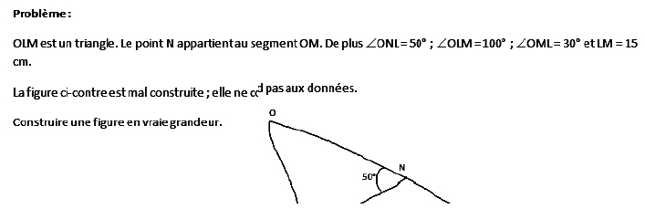 Pour un grand nombre d’entre eux, la démarche a consisté à construire soigneusement, à l’aide des instruments, le triangle OLM en respectant les mesures indiquées. La position du point N sur le segment [OL] a été établie à l’aide du rapporteur qu’ils ont fait glisser sur le segment [OM] pour que le côté de l’angle passe par L, au besoin en utilisant une règle par-dessus le rapporteur pour garantir la « précision » de la construction. Alors que tous les étudiants connaissaient la propriété de la somme des angles d’un triangle, nombre d’entre eux ne l’ont pas utilisée pour organiser leur construction (utilisation de GII pour construction dans GI). Les validations spontanées ont consisté à vérifier que les mesures d’angle étaient exactes, en particulier que l’angle ∠LNO mesurait bien 50°. Rares ont été les étudiants à repérer que le triangle OLN est isocèle en L. La correction en classe a été l’occasion de valoriser leurs connaissances théoriques et leur mise en oeuvre dans une construction. Cette activité a été une occasion unique de passage vers un nouvel ETG plus théorique.