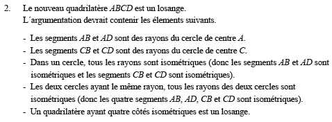 Au cours de sa formation, l’élève passe d’une géométrie intuitive, basée sur l’observation, à une géométrie déductive. C’est par les constructions et leur explicitation qu’il découvre les propriétés des figures. Petit à petit, il se dégage de la prise de mesures comme base de ses raisonnements pour recourir plutôt à la déduction. En s’appuyant sur des données, des hypothèses de départ ou des propriétés admises, il démontre des conjectures non évidentes qui servent, à leur tour, à en prouver de nouvelles. (Gouvernement du Québec, 2013, p. 53)