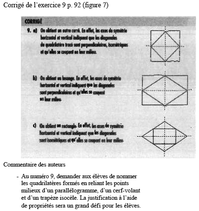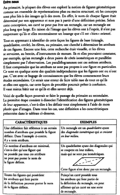 Le manuel de l’enseignant est néanmoins très précis sur les distinctions à faire entre définition (nombre minimal d’« attributs ») et propriété d’un quadrilatère ainsi que sur la classification inclusive des quadrilatères (voir Annexe 3). De ce point de vue, les auteurs du manuel prennent en charge, pour le professeur, le passage de GI à GII, prenant pour acquis que la géométrie de l’école primaire relève exclusivement de GI et celle du secondaire de GII.