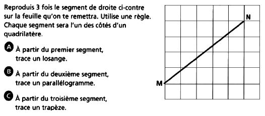 Que proposent les manuels? Dans le chapitre sur les quadrilatères de Clicmath 4e année primaire (Guay, S. et al., 2002) (voir figures 1 et 2), on trouve sur la même page deux activités où l’élève peut travailler dans GI ou en GI assumée (GI/gII). Les constructions demandées dans l’exercice 3 (figure 1) doivent être réalisées à la règle sur du papier quadrillé. Pour la construction du losange, l’élève peut mettre en oeuvre des propriétés de symétrie, d’égalités de longueur ou de parallélisme. Il peut aussi la terminer « à l’oeil » en reproduisant globalement la figure prototypique qu’il connaît. Selon les procédures que l’élève mettra en oeuvre, une telle activité pourra relever d’une GI assumée (l’élève applique des théorèmes comme des outils techniques) ou de GI (perception globale de la figure). La construction du parallélogramme peut se faire selon des procédures diverses qui relèvent des mêmes paradigmes (GI ou GI assumée) : translation du segment MN (glissement du côté qui « penche pareil ») ou tracé de deux segments de même longueur qui suivent le quadrillage. La construction du trapèze peut se faire dans GI; l’élève traçant deux segments de longueurs différentes en suivant le quadrillage.