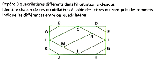L’exercice 4 est un exercice d’observation qui demande à l’élève de repérer des figures et des sous - figures; il peut répondre de manière perceptive (apparence globale de la figure) mais aussi valider ses réponses en mesurant à la règle ou en vérifiant avec son équerre. Dans tous les cas, il travaille en GI.