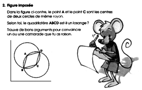 Pour répondre à cette question, l’élève peut tout d’abord dire : « c’est un losange parce que ça se voit » auquel cas il ne respecte pas le contrat. Il peut aussi mesurer les longueurs des côtés du quadrilatère (propriété connue) et se convaincre que celui-ci est un losange. Dans les deux cas l’élève travaille dans GI. Mais la consigne précise : « Trouve de bons arguments… ». Ainsi, par contrat, l’élève comprend qu’il ne peut se limiter à des réponses aussi laconiques. On peut alors imaginer qu’il va énumérer toutes les propriétés du losange et du cercle qu’il connaît (ou qu’il constate), espérant ainsi emporter la conviction de ses camarades. Il est peu vraisemblable que ces propriétés soient organisées selon un raisonnement hypothético - déductif (démonstration formelle). L’élève fonctionne dans une géométrie GI assumée (GI/gII). Concrètement, on peut penser que l’enseignant aura un rôle à jouer pour guider l’élève dans l’élaboration d’une « réponse convaincante ». D’ailleurs, dans le guide de l’enseignant, la réponse proposée est la démonstration qui se situe clairement dans GII (voir annexe 2). Nous avons ici un exemple où l’ETG de l’élève (ETG personnel) et l’ETG attendu par les auteurs du manuels (ETG idoine) ne sont pas les mêmes; le dessin n’a pas le même rôle, les validations sont le fruit de raisonnements distincts. Avec l’aide de l’enseignant, les élèves ont une opportunité d’approchée une nouvelle géométrie : GII morcelée où sont développés « des îlots hypothético - déductifs autour des propriétés de quelques figures de base » (Kuzniak, 2010, p. 80-81).