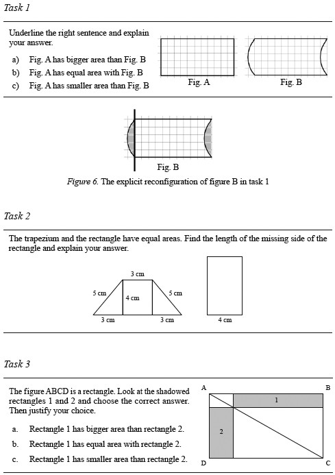 The methodology of this research is based on a part of a preliminary analysis of a questionnaire administered in order to examine the students’ geometrical figure apprehension in the sense of Duval’s (1995) cognitive analysis. The tasks were administered to 616 students, aged 14 to 16, of lower (312 in Grade 9) and upper (304 in Grade 10) secondary schools in Cyprus. In this paper three tasks (see Appendix) are described and discussed. The main common point for the selection of these three tasks is the fact that they can be solved easily and rapidly by the involvement of the operative apprehension. In fact, the students can have an immediate access to the answer if they succeed in using the mereologic modification (the reconfiguration of the given figure) and, thus, base their answer on a graphic reasoning (Richard, 2004). However, these three tasks are significantly differentiated between them as well, because of the different didactic variables they involve. Thus, despite the fact that the solutions of these tasks were expected to be related to the operative apprehension of geometrical figures, associated to different types of cognitive procedures and figural apprehension, alternative solutions could also be provided by the students.