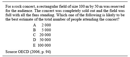 The estimation of a static crowd, in theory, is straightforward (i.e., area of the field multiplied by density of the crowd). The density rule for static crowd estimation5 is that in a loose crowd the density is about 1 person/m2, in a solid crowd has about 2 persons/m2 and very dense crowds have about 4 persons/m2 (Watson & Yip, 2011). The problem requires students to make and relate their own estimation of the amount of area that a person would take up in such a type of concert in order to solve this problem. The clues field was full, completely sold out and fans standing are there to guide students in their estimation. The fact that this is a multiple - choice question further helps them. In the above example the words and the gramatical structure give the syntax, whereas the physical and visual layout (i.e., the set of words that is presented to the students) provide the stimulus.