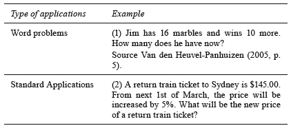 Example (1), from Table II, is a problem involving marbles; context is not relevant to practise addition. Besides, as a matter of fact, if the word marble was blocked out, this problem still can be solved. Additionally, the context can be exchanged for another context without altering the demands of problem. To some extent different to word problems, standard applications problems are embedded in either real - world contexts. Nevertheless, standard application problems tends to “focus on the direction: mathematics → reality” (Blum, Galbraith & Niss, 2007, p. 10) and therefore they generally emphasises the mathematical concepts involved. In simple words, “with applications we are standing inside Mathematics looking out: Where can I use this particular piece of mathematical knowledge” (Blum, Galbraith & Niss, 2007, p. 10). They are characterised by the fact that the “appropriate [mathematical] model is immediately at hand” (Blum, Galbraith & Niss, 2007, p. 12). The latter suggests that in standard applications, students need to be taught specifically about how a mathematical concept applies before practising it. Example (2) in Table II above, provides an illustration of this kind of problems. The mathematical concept of percentages is embedded in a real life situation (the purchasing of travel tickets); the mathematical model to solve the problem is immediately at hand (, therefore the new price is $152.50), extra information is not needed because it is widely assumed by the teacher that students know how to use a particular model in a range of contexts (i.e., the mathematical model has been taught to students for its relevance to everyday life). Hence, the context plays a secondary role, that is to say, the context is treated routinely because students have been taught how to use a particular piece of mathematics which fits into a predetermined model or technique.
