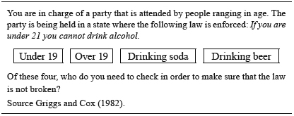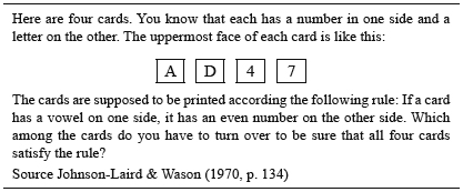 Participants were presented with four cards, showing respectively A, D, 4, 7. It is known that every card has a letter on one side and a number on the other. Participants were then given the rule: If a card has a vowel on one side, then it has an even number on the other side, and were told: Your task is to say which of the cards you need to turn over to find out whether the rule is true or false. Out of 128 undergraduate university students, only five chose the two right cards (Johnson - Laird & Wason, 1970).