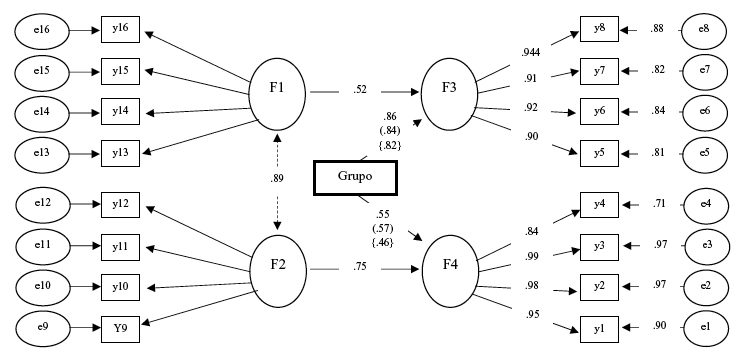 Como se puede apreciar en la Figura 1, las variables latentes F1 y F2 representan las medidas de las competencias matemáticas informales y formales respectivamente, en el momento 1 (pretest). Las variables latentes F3 y F4 representan las mismas medidas en el momento 2 (postest). Las estimaciones entre la variable latente grupo con cada una de las variables latentes en el post - test (F3 y F4) reflejan la estimación estandarizada entre GT vs. GC (valores estimados expresados sin paréntesis); GT-leve vs. GC-leve (estimaciones entre paréntesis) y GT-moderado vs. GC (estimaciones entre llaves).