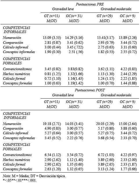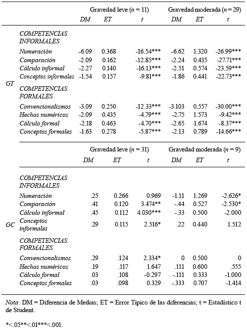 Tal y como se muestra en la tabla III, se observa que en el GT existen diferencias significativas entre todas las medidas recogidas antes y después de la intervención para los dos niveles de gravedad. Sin embargo, en el GC se observaron diferencias estadísticamente significativas en comparación de cantidades y cálculo informal para el nivel de gravedad leve, y en numeración y comparación de cantidades para el nivel de gravedad moderada. En cuanto a las competencias formales, únicamente se observaron diferencias estadísticamente significativas entre las puntuaciones pretest y postest en convencionalismos para el nivel de gravedad leve, no reflejándose diferencias entre ninguna de las competencias formales cuando el nivel de gravedad es moderado.