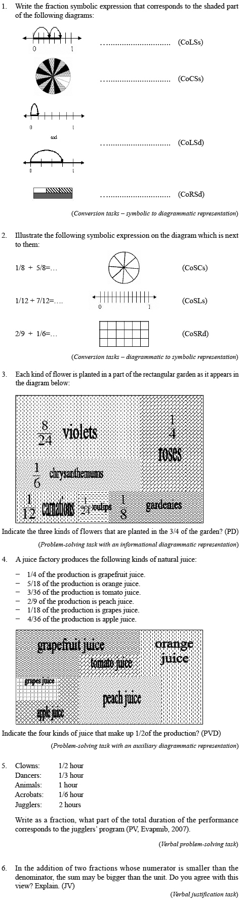The tasks were designed in such a way that they could be similar to a variety of situations and tasks on fractions that are included in the Mathematics textbooks used in Cyprus. The designing of the tasks preceded a detailed analysis of the content of the mathematics textbooks of the four grades under study (Deliyianni et al., 2007). In conversion tasks the representations (i.e., source and target) that students were asked to use were predetermined. In problem - solving tasks the only predetermined or given representation was the system(s) of representation of the statement of the problems, while the representational transformation processes that students need to apply in order to reach a solution are tacitly required (i.e. indirect treatments, recognitions and conversions).