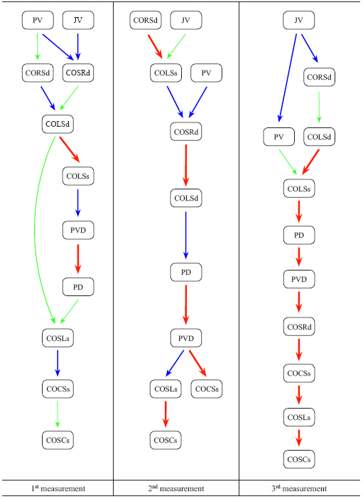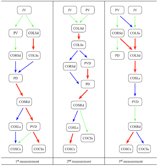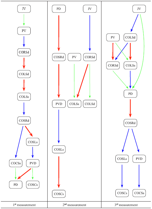 At the first measurement the most difficult tasks are the verbal problems for the students who move within secondary school (Grade 7 to 8). These tasks are the most difficult at the second and third measurement as well. Students’ improvement through measurements is evident in the implicative chains. A characteristic example is the different denominator fraction - addition conversion task from a symbolic to a rectangular area diagram (COSRd) that is found in the beginning of the implicative chain at the first and second measurement but at the third measurement it is found at its end.