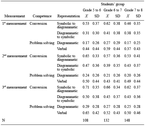 The students who move within secondary school (Grade 7 to 8), exhibit a stability of performance in the one - year period between the first and the third measurement in conversion tasks from a diagrammatic to a symbolic representation (t=-1.66, df=147, p=0.05). An important improvement in their performance is noted, though, in conversion tasks from a symbolic to a diagrammatic representation (t=-4.76, df=147, p<0.05), verbal problems (t=3.28, df=147, p<0.05) and problem-solving tasks that are accompanied by a diagram (t=-3.43, df=147, p<0.05).