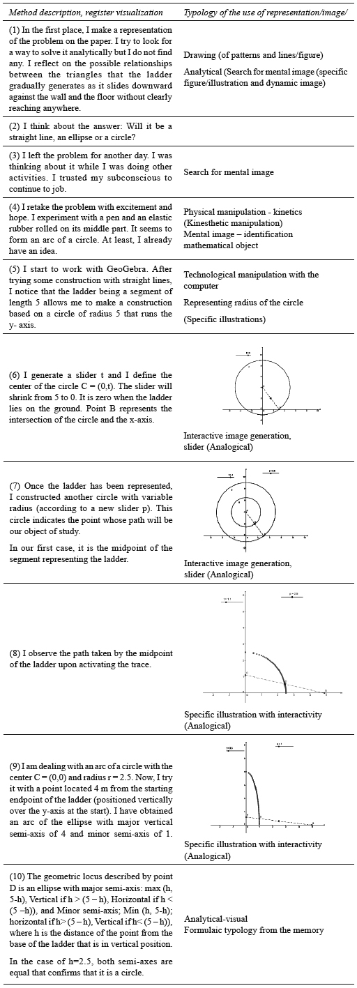 The student first looks for the mathematical object, but he becomes blocked (Annex 1, 1). He even attempts a physical construction. This allows him an iconic visualization that turns into a visual and semiotic exploitation within the environment of dynamic geometry. For instance, in Annex (1) when the student ”search for mental image”, we see a process of “implemented discovering” in which the student seeks empirically, as if his figures were objects of experimentation, anticipating satisfactory loci. In this case we can recognize moments of completing the inductive reasoning by analytical reasoning indications. Other times, this analytical reasoning is explicit like in Annex 1 (10).