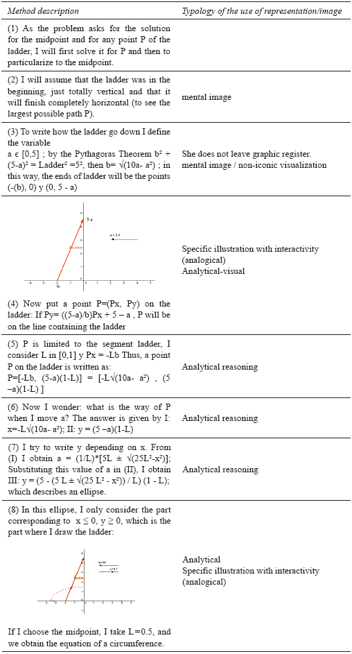 The behavior of this student shows us some limits about visual apprehension. Although this student indicates that visual register was used for problem solving, she highlights that she does not like to solve the problem with a computer: “I’m not very excited about it, because I do not use it frequently. I think it would be sufficient to know the language (and I already know the analytical resolution) and to do as much an exercise per week to remember the language and to use it with students, in case you have time and/or you need it”. She gives more value to analytical thinking than visual thinking and she attributes less value to solve problems with computer.