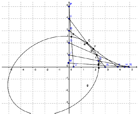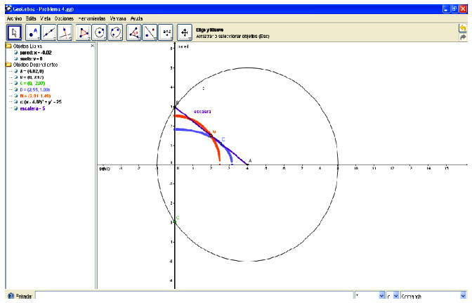 Iconic / non - iconic visualization: The representation of this problem is iconic, it is easy to imagine and draw a ladder slipping along the wall. But the point is that to construct a good representation of the ladder, we need to use auxiliary (non - iconic) objects, as a circle, because the direct approach (considering the ladder as a general segment) does not allow us to produce a dynamic representation. (See comments below, on students’ results). In this case, the auxiliary objects are needed for technical reasons. In GeoGebra, a segment is given by two points and if we move one of the points (say, along the wall) the segment just extends or shrinks. To obtain a segment that behaves as a ladder, we need a “technical” auxiliary construction. On the other hand, we must be precise in the definition of the midpoint, or any point of the ladder, this time for mathematical reasons. Hence, students must take care in the modelization of the problem, for technical and mathematical reasons.