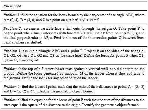 Six non - routine geometric locus problems were posed, to be solved using GeoGebra during the training session. The problems are posed in an analytic register. Each problem admits several kinds of resolution, including a visual one. Thus the problems allow the study of the students’ behavior with the coordination of registers and they enable us to compare results between those who make a conversion to the graphic register and those who do not. Finding the solutions to the problems required to follow a sequence of visualization, technical, deductive and analytical steps.