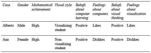 To deepen the relationships that occur between instrumental genesis and figural genesis, we conducted a case study. Here, we illustrate the situation with two students who do not use the “locus command” for solving problem 4. This phenomenon occurs due to a difficulty in the articulation between the instrumental and figural genesis. The criteria to choose these students are based on their mathematical performance level, their visual cognitive style or preference for visual thinking, beliefs and feelings toward computer learning, and beliefs and feelings about visual thinking (Table 2). In the presented cases, we observe two different strategies of instrumental deconstruction, based on the different starting points of the subject.