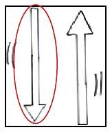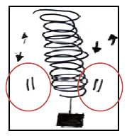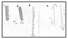 De inicio, se les pide a los participantes que describan y expliquen las características del movimiento del resorte cuando se coloca una pesa y después que “dibujen” dicho movimiento. Como podría esperarse, las explicaciones y dibujos no tienen relación con gráficas cartesianas. Generalmente, se describe y argumenta por medio de trayectorias y dibujos icónicos (figuras 2, 3 y 4). Existe la necesidad de dibujar aquello que se mueve, complementando con íconos que describen aspectos como la velocidad, fuerza o rapidez (figura 4). O bien, disponen de íconos para indicar un orden temporal o para describir etapas (figura 5).