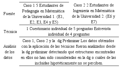 Se trabajó con siete estudiantes de las carreras de Pedagogía en Matemática e ingenierías de dos universidades de un país sudamericano. La selección de los estudiantes en estas dos universidades trabajadas como casos —indagación en profundidad de una realidad específica— (Stake, 2010) se vinculan con los siguientes aspectos: 1) heterogeneidad de los estudiantes que pertenecen al conjunto; 2) historial matemático de los estudiantes; 3) existencia en su malla curricular de las asignaturas de álgebra y álgebra lineal; 4) rendimiento óptimo en el curso álgebra lineal; 5) reprobación nula en las asignaturas de álgebra básica; 6) estudiantes voluntarios; 7) accesibilidad de los investigadores. La tabla i resume la información en cuanto a fuentes y técnicas utilizadas.