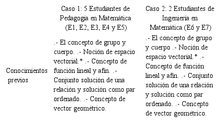 Estos conocimientos previos se refieren a conceptos que ya han estudiado estos siete aprendices en sus cursos de secundaria, y son tópicos que ellos evocarán en algún estado de construcción para dar respuesta a las actividades propuestas en los instrumentos que se les aplicaron. Con esto último queda de manifiesto que los investigadores no han intervenido los casos de estudio antes de la aplicación del cuestionario y la entrevista.
