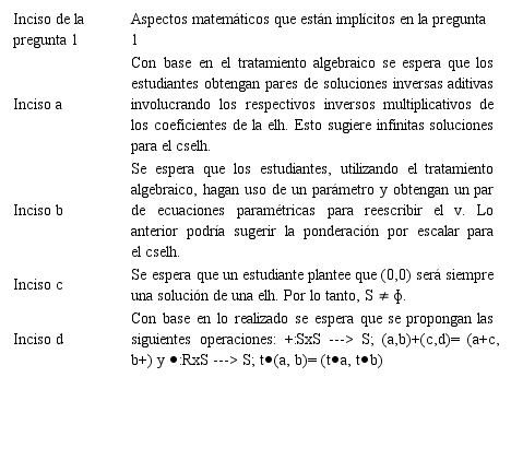 El objetivo de la pregunta 1 es indagar si la acción asignar pares de números reales, inversos aditivos en los términos de una elh se interioriza en el proceso solución de una elh, verificando que los nuevos pares de números reales satisfacen la ecuación. Lo anterior requiere, como conocimiento previo, del grupo aditivo y multiplicativo de los números reales como proceso. Por otro lado, se desea constatar si comparar soluciones inversas aditivas de una elh actúa como mecanismo de coordinación para construir el proceso adición de soluciones a partir de los procesos cselh y operación binaria. Finalmente, se desea saber si coordinando los procesos de múltiplo escalar en el cselh y de ponderación de las coordenadas, a partir del gráfico de la función lineal con el uso de un parámetro, es posible construir el proceso ponderación de una solución para el cselh.