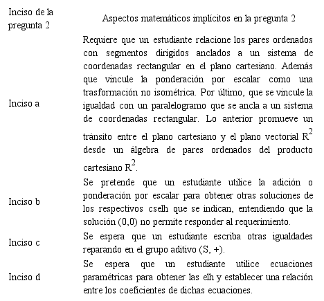 La pregunta 2 tiene por objetivo evidenciar la coordinación de los procesos suma de soluciones y ponderación de una solución en el proceso álgebra de soluciones. Por otro lado, se espera que a partir de la coordinación entre los procesos asociados con los segmentos dirigidos de las rectas vectoriales, y el de la relación entre la diagonal de un paralelogramo y sus lados no paralelos anclados al origen del sistema de coordenadas, se construya el proceso que permite articular el plano cartesiano con el plano vectorial R2 desde la estructura algebraica que se ha obtenido para el producto cartesiano R2.