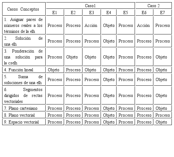 La intención de cada una de las preguntas diseñadas para el guión de la entrevista fue analizada y consensuada por los investigadores. La pregunta 1 tuvo por objetivo mostrar si el proceso álgebra de soluciones se puede construir simultáneamente entre el espacio vectorial R2 y un subespacio propio de éste. La pregunta 2 permitió indagar en la construcción del proceso cselh para luego evidenciar la encapsulación del mismo en el objeto cselh provisto de operaciones no usuales. La pregunta 3 permitió describir la construcción del conjunto generador de una recta vectorial como proceso. Finalmente, la pregunta 4 permitió mostrar la desencapsulación del objeto espacio vectorial R2 en el proceso recta vectorial.
