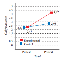 Se deduce que a tenor de los resultados totales (Gráfico 14), las medias totales del GC y del GE en Pretest eran iguales. No obstante, las puntuaciones de ambos grupos en el Postest difieren de 4,27 el GE y 2,95 el GC.