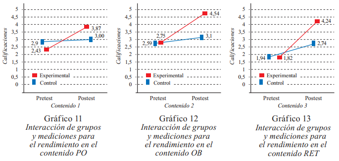 Atendiendo a los contenidos, los resultados evidencian que los y las integrantes del Grupo Experimental mejoraron significativamente en todos los casos al aplicar el segundo cuestionario, mientras que el Grupo Control se mantuvo estable o aumentaba poco su rendimiento. A la vista de los gráficos 11, 12 y 13, la interacción de grupos y mediciones para el rendimiento por contenidos en Pretest –tanto en el GC como en el GE–, demuestran que PO es el más alto, seguido de OB y por último RET.