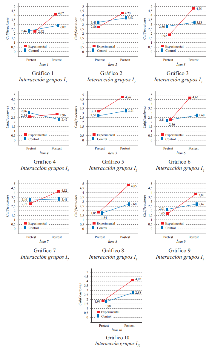 Con respecto a los dos grupos (Grupo Control y Grupo Experimental) y a los 10 ítems del cuestionario, se logró que el Grupo Experimental mostrara mayores aciertos en comparación a la primera aplicación del mismo, mejorando sustancialmente en comparación al Grupo Control que se mantuvo estable o aumentó mínimamente su rendimiento. En concreto, destaca la mejoría en los ítems 1, 5, 6 y 8, siendo el 6 enel que se evidenció una mayor diferencia. En los ítems 2, 3, 4, 7 y 9 el Grupo Control tuvo mejores calificaciones en el Pretest que el Grupo Experimental, sin embargo, en el Postest destacó el Grupo Experimental.