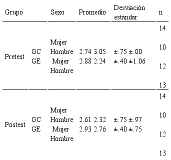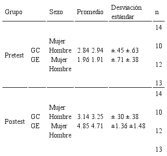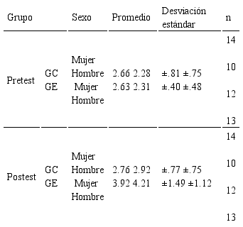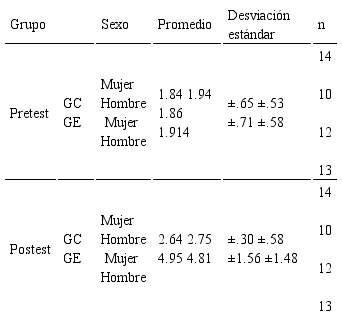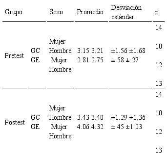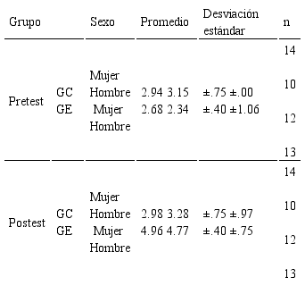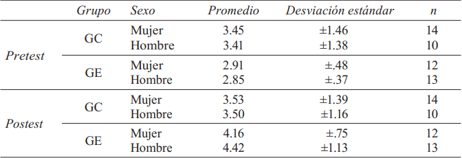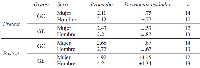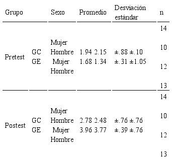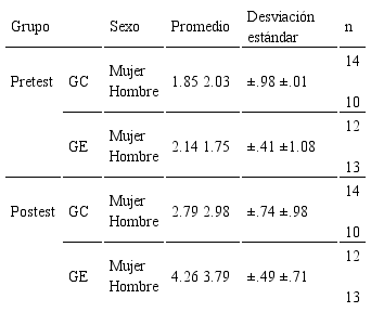 En particular, se manifiesta que el rendimiento de los hombres ha experimentadouna mejoría en el grupo GE, mientras que las mujeres tienen una media menor. Sedebe tener en cuenta que las puntuaciones de partida eran superiores en las mujeres en GC y GE, y en la puntuación Postest son mayores las obtenidas por los hombres.