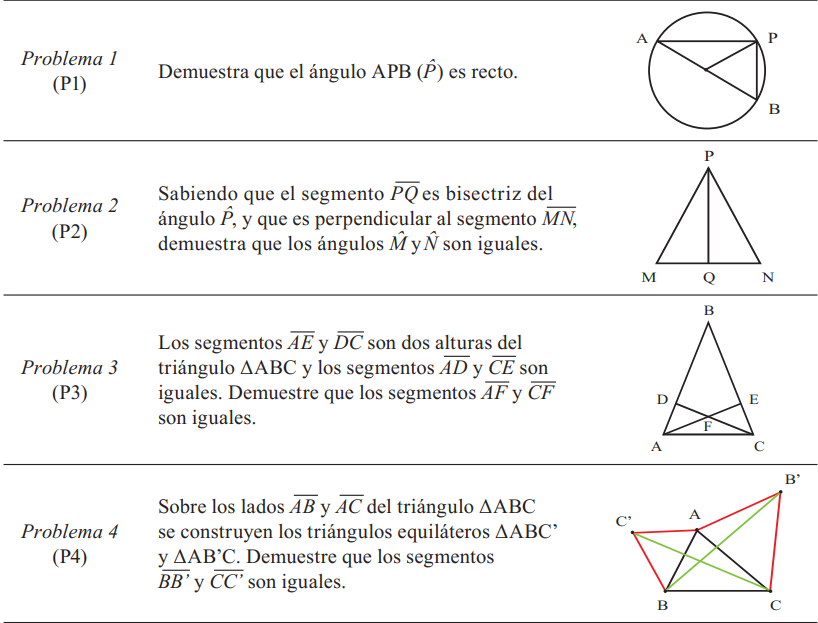 Los estudiantes debían resolver cuatro problemas en los que se presentaba una configuración geométrica asociada a un enunciado y se les solicitaba probar un hecho geométrico. El objetivo de los problemas era determinar cómo los estudiantes iban desarrollando procesos coordinados de aprehensiones discursivas y operativas, identificando subconfiguraciones que guiasen su razonamiento y les permitiese establecer una cadena o secuencia de argumentaciones que concluyese con la tesis a probar.