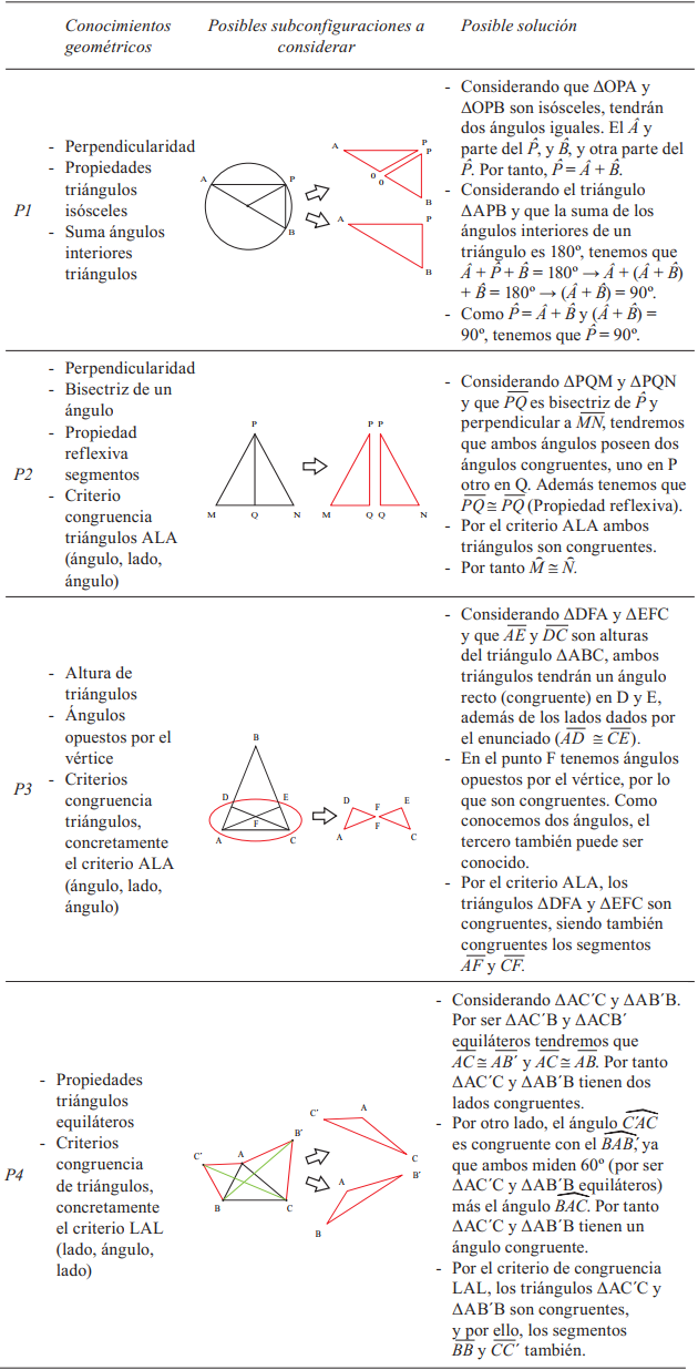 Es necesario señalar que en P4 se da un solapamiento entre las subconfiguraciones relevantes a identificar, hecho que requiere acciones cognitivas más complejas para poder visualizarlas por separado. Por este motivo, se mostraron los diferentes elementos geométricos indicados en el enunciado en distintos colores, con el objetivo de “facilitar” su identificación. Entendemos, por tanto, que las configuraciones desempeñan un papel descriptivo, ya que, junto con el enunciado del problema, ayudan a contextualizar la situación geométrica planteada en cada caso y un papel heurístico al proporcionar diferentes estrategias de resolución en función de las subconfiguraciones identificadas.