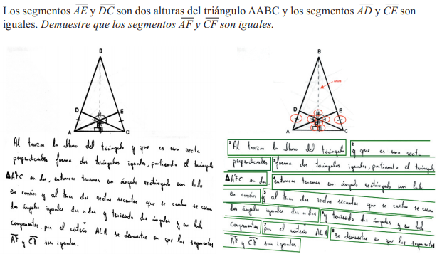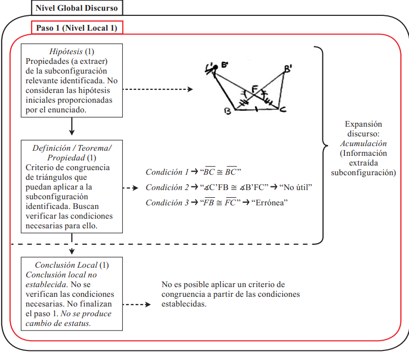 Esto se debe a que las afirmaciones matemáticas establecidas se sitúan dentro del mismo nivel local de organización del discurso. Como estas afirmaciones no verifican ningún criterio de congruencia que puedan aplicar a la subconfiguración identificada, los estudiantes no concluyen el “paso” iniciado, no generando más discurso escrito. Por tanto, no se produce un cambio en el estatus operativo de las afirmaciones involucradas, ya que no son capaces de finalizar el “paso” analizado con una afirmación matemática con estatus de “conclusión local” a partir de las afirmaciones con estatus de “hipótesis”.