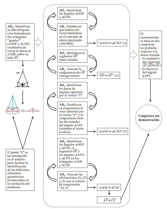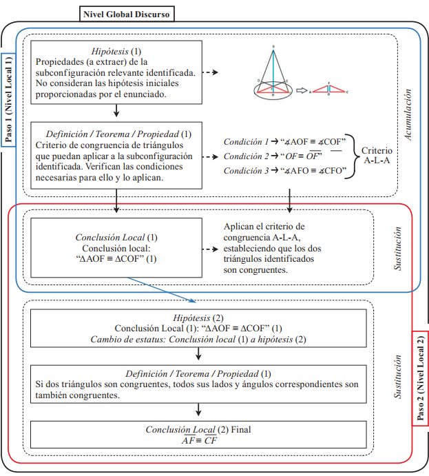 En el segundo paso de razonamiento, la conclusión local (1) (congruencia de los triángulos AOF y COF) pasa a desempeñar el papel de hipótesis inicial (2), a partir de la que “infieren” que en dos triángulos congruentes, todos sus lados y ángulos correspondientes, son congruentes también, concluyendo que los segmentos y son congruentes (conclusión local (2)). Por tanto, se produce un cambio de estatus: la conclusión (local) del “paso 1” pasa a desempeñar el rol de hipótesis del “paso 2”, permitiendo a los estudiantes finalizar el “paso 2” estableciendo otra conclusión local (2), que es, además, la “conclusión final” del razonamiento llevado a cabo (tesis a demostrar).
