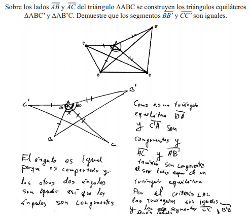 Entendemos que el razonamiento configural desemboca en truncamiento cuando los ciclos de aprehensiones operativa/discursiva proporcionan la “idea” de cómo se resuelve el problema a los estudiantes, conduciéndoles a establecer una solución válida. En este sentido, los estudiantes son conscientes que, si demuestran la congruencia de los triángulos ABB’ y ACC’, de forma implícita queda demostrada la tesis del problema, finalizando por tanto el razonamiento configural una vez establecen la congruencia de los triángulos implicados en el razonamiento. Por ello, el razonamiento configural desemboca en truncamiento, ya que ha proporcionado la “idea” que permite a los estudiantes resolver el problema.