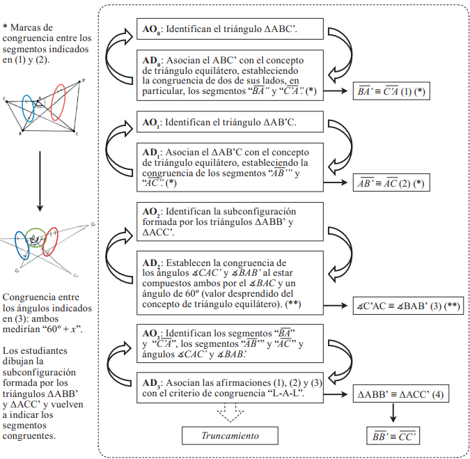 En este caso, los estudiantes comienzan los ciclos de aprehensiones operativa/discursiva (Figura 9) considerando la subconfiguración formada por el triángulo ABC’ (AO0), a la que asocian el concepto de triángulo equilátero (AD0). Ese hecho les permite establecer la congruencia de los lados del triángulo indicado, en particular, de los lados formados por los segmentos y . De forma análoga, consideran el triángulo AB’C (AO1) al que asocian el concepto de triángulo equilátero (AD1) para establecer la congruencia de dos de sus lados (los formados por los segmentos y ).