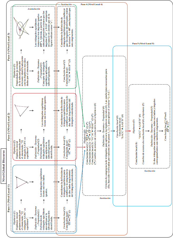 En el presente trabajo consideraremos dos de los tres niveles de organización discursiva propuestos por Duval (1998): nivel global y nivel local. El nivel global estaría formado por el total del discurso teórico que conforma la prueba, en el que los “pasos” de razonamiento (niveles locales) que lo componen se relacionan entre sí por su conclusión (conclusiones locales). Consideramos como nivel local cada “paso” de razonamiento en que se divide el nivel global, que permite avanzar hacia la resolución del problema y en el que al menos tres afirmaciones matemáticas son organizadas en función de su estatus: hipótesis o conclusión previa; definición, teorema, propiedad o inferencia de información extraída del contexto de resolución; y conclusión local. Por tanto, cada “paso” de razonamiento se caracteriza por la organización de las afirmaciones matemáticas involucradas en función de sus estatus, pudiendo considerar como razonamiento el “paso” de premisa a conclusión a través de la aplicación de reglas (normas) del sistema lógico-deductivo dentro de cada nivel local de organización deductiva. Entendemos, por tanto, que un razonamiento deductivo conducente a probar un hecho geométrico involucra dos niveles diferenciados de organización discursiva: cómo se organizan las afirmaciones matemáticas dentro de cada “paso” deductivo y como se organización los diferentes “pasos” durante la resolución de problemas de probar.