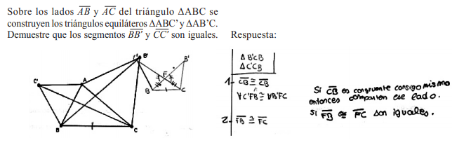 De forma análoga, en el “paso 2”, identifican el triángulo AB’C al que aplican el concepto de triángulo equilátero (al considerar los datos proporcionados por el enunciado) que les permite establecer (de forma implícita) la congruencia de sus lados, que les permite concluir el “paso” considerando la congruencia de dos de sus lados en particular. Por tanto, en el “paso 2” se dan la “acumulación” y la “sustitución”.
