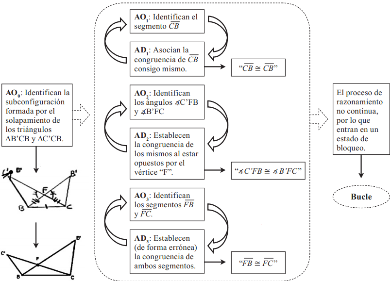 Una vez establecen las tres afirmaciones matemáticas indicadas, no continúan con la resolución del problema, entrando en una situación de bloqueo, por lo que el razonamiento configural desemboca en “bucle”. Los estudiantes establecen una afirmación matemática errónea () y otra que carece de sentido, de utilidad, (C’FB y B’FC) si consideramos la subconfiguración inicial identificada. Este hecho indica que el grupo ha intentado asociar algún criterio de congruencia de triángulos con la subconfiguración inicial identificada (triángulos C'FB y B'FC), que les permitiría demostrar la tesis planteada, ya que ambos triángulos contienen los segmentos y de los que se debe demostrar su congruencia. Para ello, han pretendido verificar condiciones en la subconfiguración inicial identificada para aplicar un criterio de congruencia, lo que les ha conducido a realizar tres ciclos coordinados de aprehensiones operativa/discursiva. Sin embargo, las condiciones extraídas, no verifican ningún criterio de congruencia para la subconfiguración identificada, por lo que entran en un estado de bloqueo.