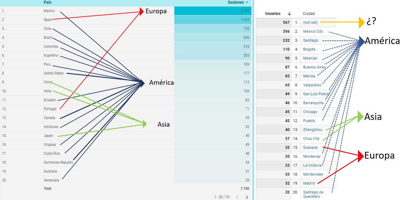En la Figura 2 se encuentra el reporte de procedencia de los 20 principales países que aportan visitantes al sitio web de Relime. Se identificaron usuarios de tres continentes y, con base en ello, nos preguntamos: ¿tendrá Relime lectores en Asia?, de ser así, la revista estaría cumpliendo con uno de sus diversos propósitos iniciales que ha sido el de ampliar la visibilidad de la investigación en Matemática Educativa que se produce en nuestra región. Asimismo, se puede observar que las consultas provienen en su mayoría del continente americano, lo cual indica que Relime se ha convertido en referente dentro de la disciplina en esta región del orbe.