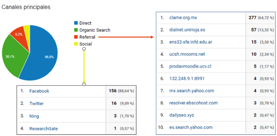 Por otro lado, Google Analytics nos permite identificar el método de adquisición de usuarios, que es la forma en que estos llegan al sitio web. En este sentido hemos encontrado que en su mayoría provienen directamente, es decir, escriben la URL de la revista en la barra superior de búsqueda. El segundo medio de adquisición es vía “búsqueda orgánica”, esto significa que los usuarios llegan al sitio haciendo una búsqueda en alguno de los buscadores web, acerca de un tema en particular y de alguno de los resultados, son llevados al sitio de Relime. Luego, se encuentran los “referidos”, que son aquellos usuarios que llegan a Relime vía enlace en otros sitios. En su mayoría provienen del sitio del Comité Latinoamericano de Matemática Educativa (Clame) que es el organismo oficial del cual nace Relime. Finalmente, vemos que un mínimo de los lectores llega vía redes sociales, en su mayoría a través de Facebook.