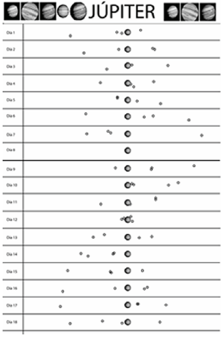 Ante las astrofotografías captadas de júpiter y sus satélites, el investigador le pregunta a Pedro cuál satélite es cada uno de los cuatro puntos brillantes (véase figura 9). Alejándose de los otros expertos, extrae de la base astrofotográfica las imágenes correspondientes a 18 noches consecutivas y las coloca así: la primera imagen en un primer renglón, la segunda imagen en el segundo renglón y así sucesivamente hasta distribuir las 18 imágenes en una columna, cuidando que los círculos más grandes que representan a Júpiter queden alineados (figura 10). Coloca una etiqueta en cada renglón para indicar el número de día en que fue captada la astrofotografía.