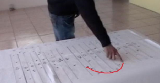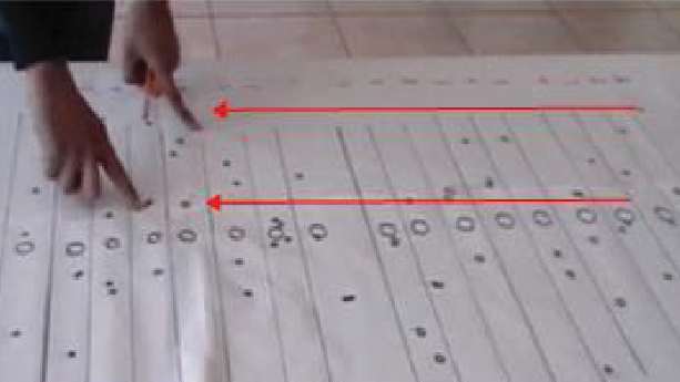 Con su dedo sigue el posible comportamiento del satélite más alejado (figura 12). La forma de usar lo periódico se manifiesta a través de la detección de un patrón de repetición: una unidad de análisis visual. Él menciona que “podría ser la misma”, “parece ser la misma”, “del mismo estilo”; este encadenamiento de argumentos culminará en la detección de una unidad de análisis cuando el experto menciona más adelante “aquí se encuentra otra (luna)”.