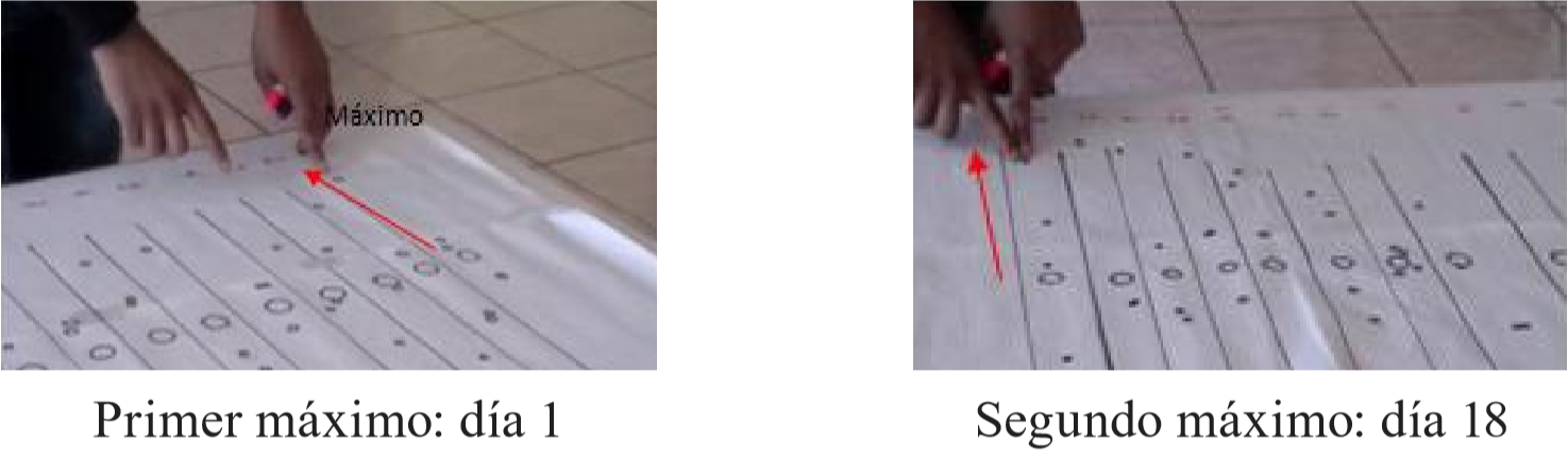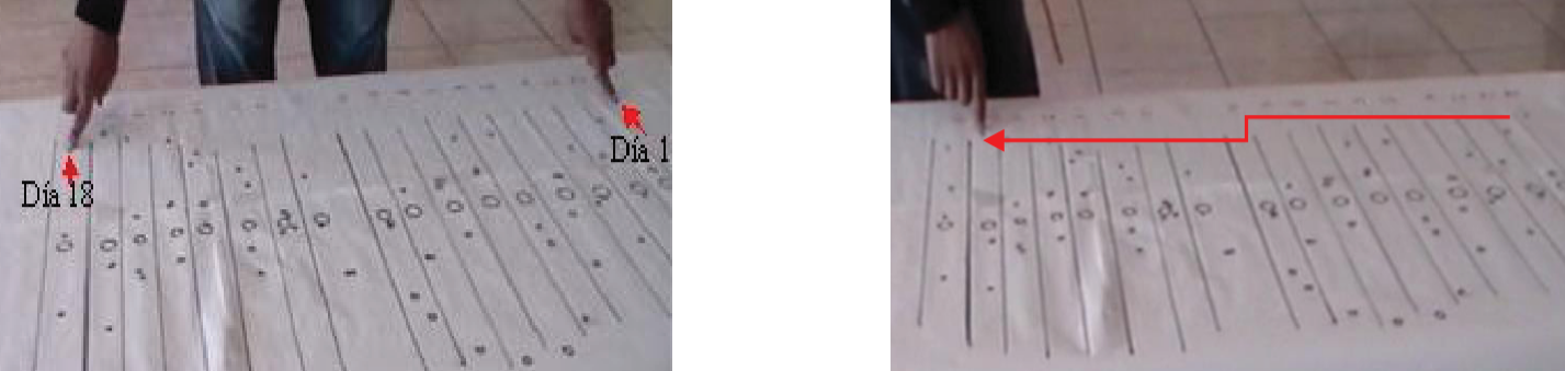 Pedro: También, esta proyección nos ayuda mucho. como están a la misma escala yo hago una línea vertical… y aquí estoy otra vez (con sus dedos traza paralelas desde el día uno hasta el día 18, figura 18)
