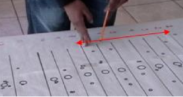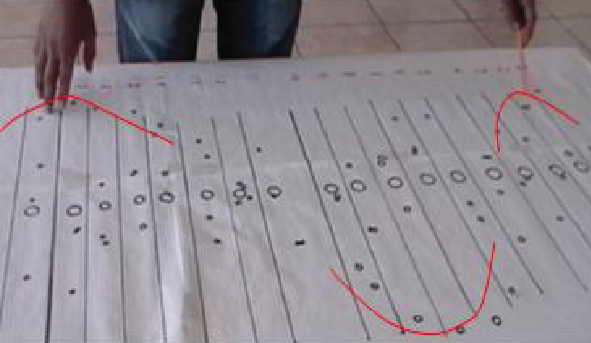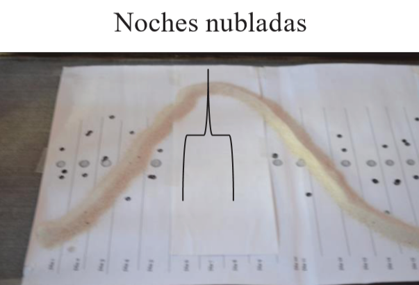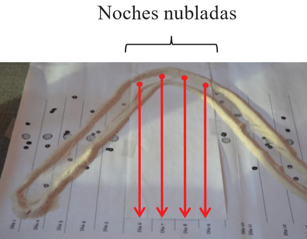 Ahora remueve un poco la arena, abriendo una franja en medio, para dejar ver el comportamiento de la luna correspondiente a las noches despejadas. la conclusión es que en las noches nubladas la luna más alejada debe estar en la franja (marcas rojas en la figura 23).
