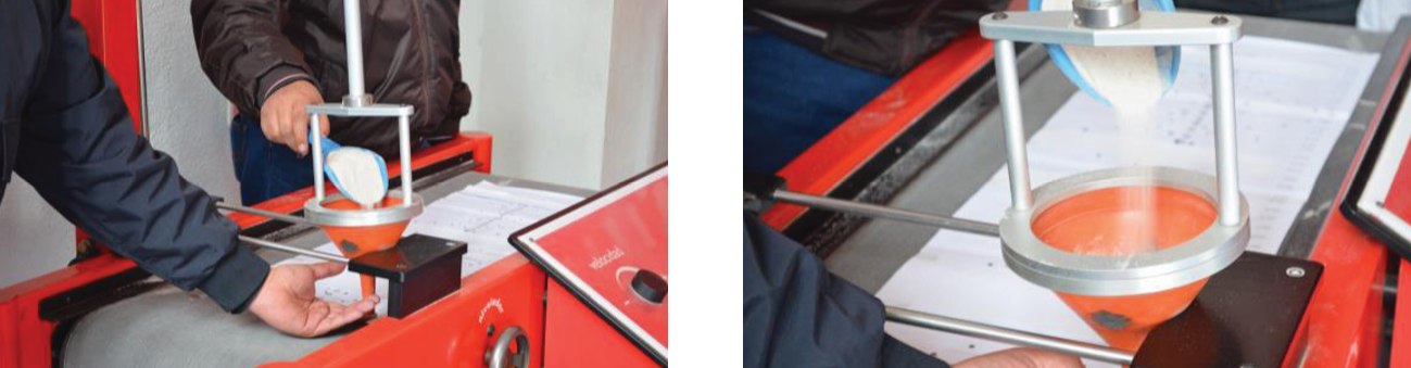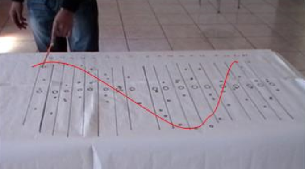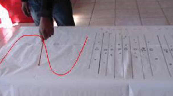 El péndulo del museo deja su traza sobre arena, así que Pedro coloca la secuencia de fotografías, con el trozo de papel en blanco intercalado, sobre la banda móvil del mecanismo donde está el péndulo. alimenta el péndulo con arena, hace variar su longitud y la velocidad de la banda hasta que el rastro se parezca al comportamiento de los satélites en la información que sí se tiene. ubica entonces el péndulo en el alejamiento máximo y lo deja oscilar libremente (figura 21).
