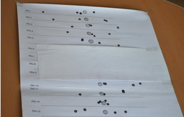 Pedro: Porque aquí tengo un periodo de 17 días. esta luna de aquí coincide con esta luna de acá. (Señala la luna del día uno con la luna del día 18, figura 17)