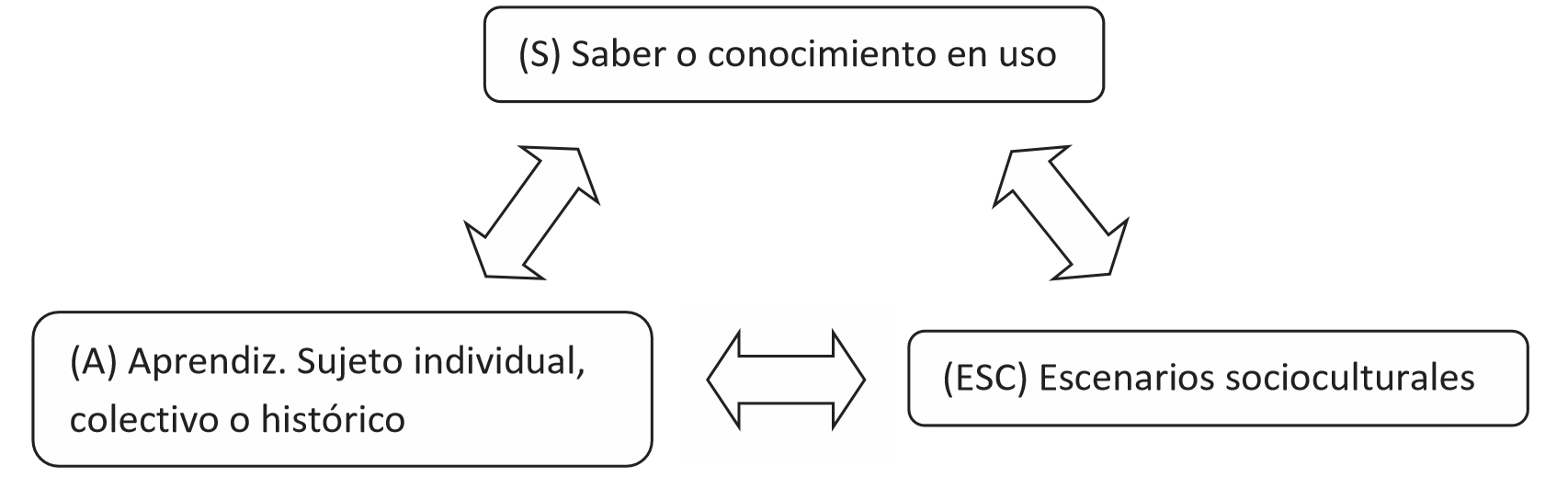 La investigación socioepistemológica desarrolla estrategias de investigación que permiten poner al descubierto aquellas circunstancias relacionadas con la generación del conocimiento matemático; éste puede evidenciarse entonces como articulado, totalmente situado, y su uso es lo que se transforma en el objetivo a desarrollar. De acuerdo con Cantoral (2013a), se suple la idea de aprendizaje como adquisición para dar lugar a ese conocimiento en uso que modifica al individuo ante tareas de su propio entorno vivencial. Estos elementos conforman un triángulo didáctico propio de la Socioepistemología (figura 3) y, de hecho, con esta base construimos el diseño metodológico de la investigación presentada en este escrito (véase sección 5.1).
