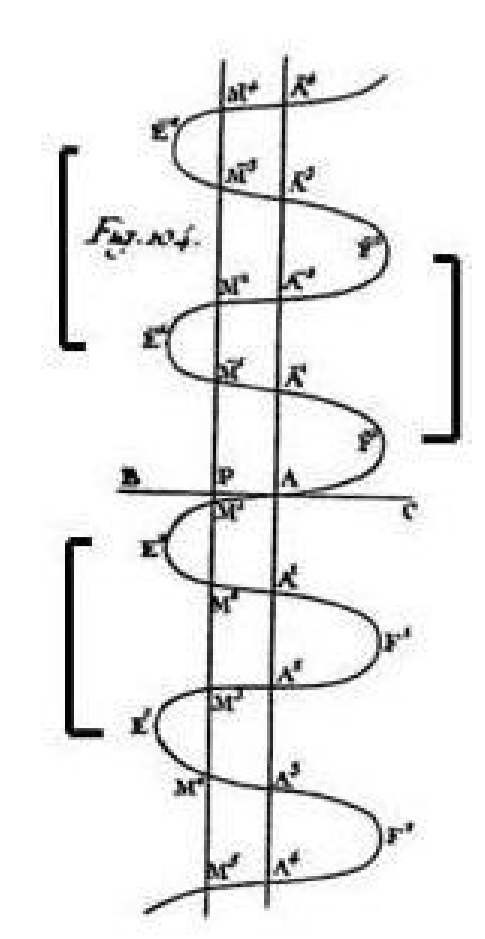 Cuando la historia se convierte en una fuente de significación para la matemática, se obtienen elementos que enriquecen un comportamiento periódico. Por ejemplo, Euler (Euler, 1948), el primer matemático que caracterizó una función periódica, lo hacía en realidad a través del comportamiento repetitivo de la curva sin la expresión analítica de la función. En la figura 5 podemos ver una ilustración de dicha caracterización en la que señala que los intervalos marcados con corchetes son iguales y, así, la curva es periódica.
